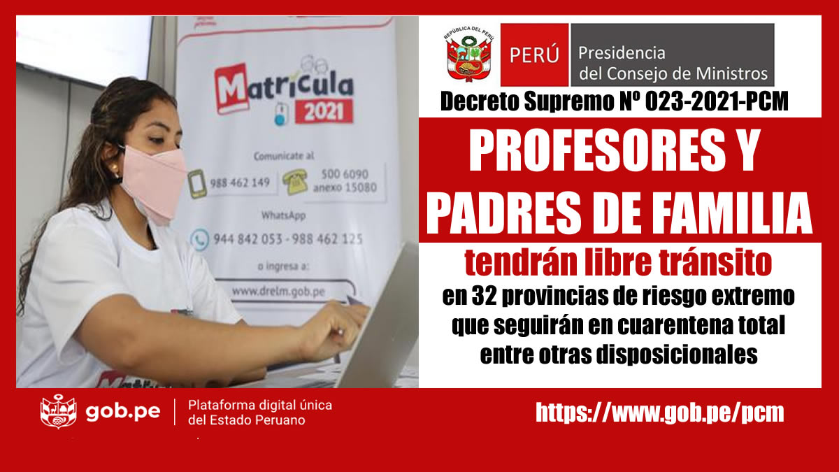 PROFESORES Y PADRES DE FAMILIA tendrán libre tránsito en 32 provincias de riesgo extremo que seguirán en cuarentena total entre otras disposicionales (Decreto Supremo Nº 023-2021-PCM)