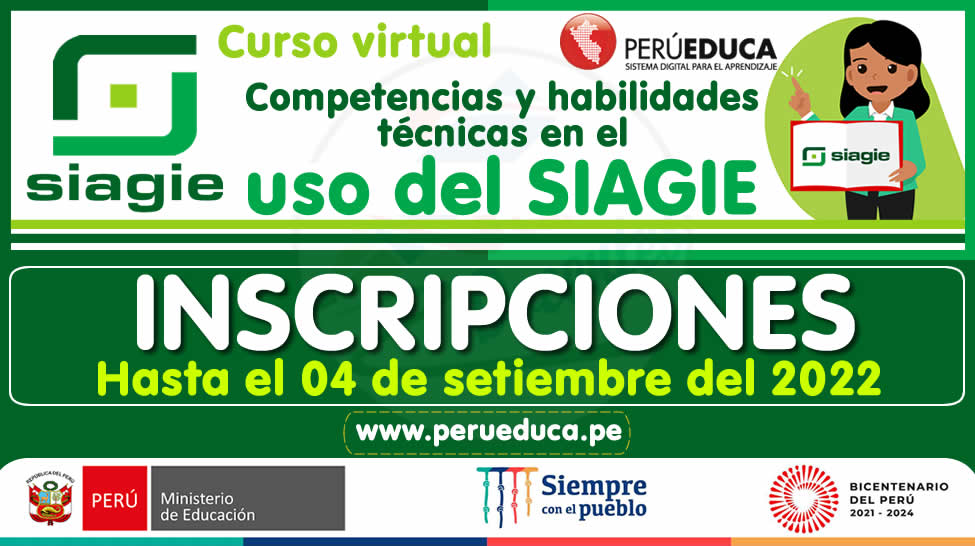El 09 de setiembre se dará inicio al curso virtual autoformativo “Fortalecimiento de Directores, Personal Administrativo y Auxiliares de Educación de II. EE. en el manejo del SIAGIE”, de manera gratuita a través del portal PerúEduca, ofreciendo 15 mil vacantes a nivel nacional. Está dirigido a los siguientes perfiles: directores, auxiliares de educación y personal administrativo focalizado (coordinador administrativo, oficinista, secretaria, técnico administrativo, auxiliar administrativo, auxiliar de biblioteca, auxiliar de laboratorio y otros puestos similares a los descritos).