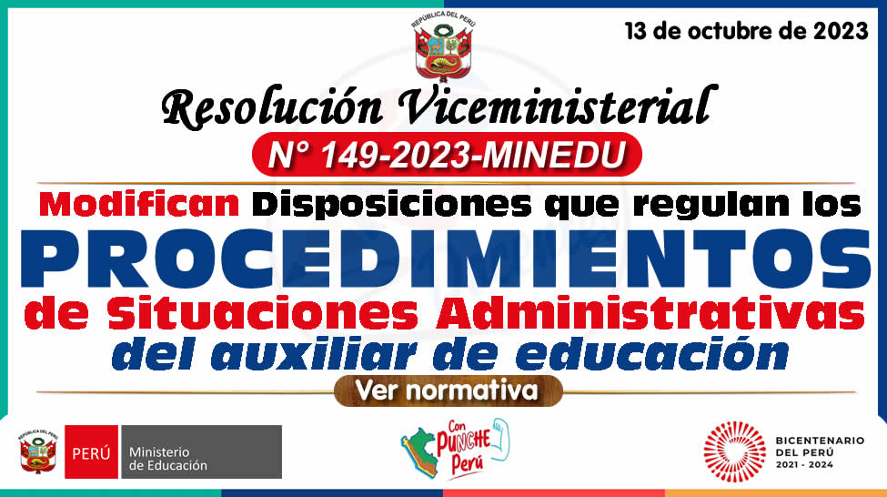 Resolución Viceministerial N° 149-2023-MINEDU | 11 de octubre de 2023 | Modificar los literales C. y E. del numeral 7.4.12 de la Norma Técnica denominada “Disposiciones que regulan los procedimientos de las situaciones administrativas y otros aspectos laborales del auxiliar de educación, en el marco de la Ley N° 29944, Ley de Reforma Magisterial”, aprobada por el artículo 2 de la Resolución Viceministerial N° 126-2023-MINEDU
