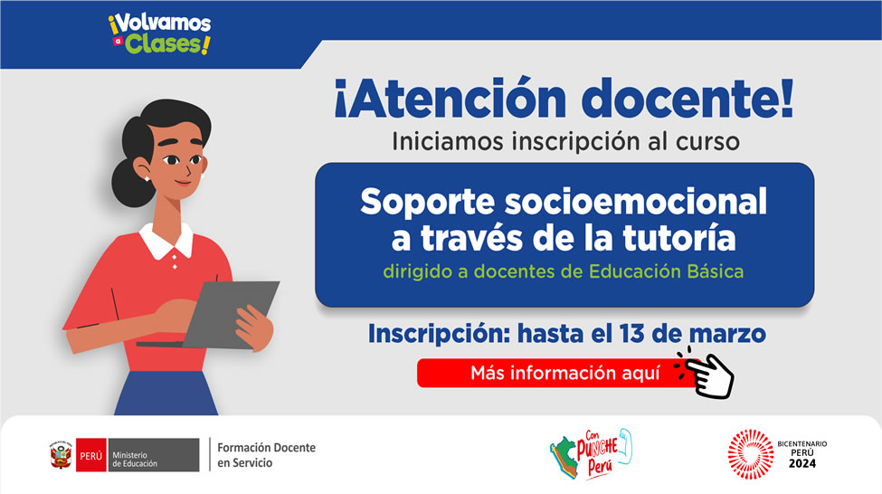 El curso virtual: “Soporte socioemocional a través de la tutoría”, dirigido a docentes de educación básica tiene una duración de 48 horas lectivas, se desarrolla en el marco del buen inicio del año escolar 2024 y se implementará desde la plataforma del Sistema Integrado de Formación Docente en Servicio -Sifods, plataforma donde podrás inscribirte a partir del 15 de febrero.
