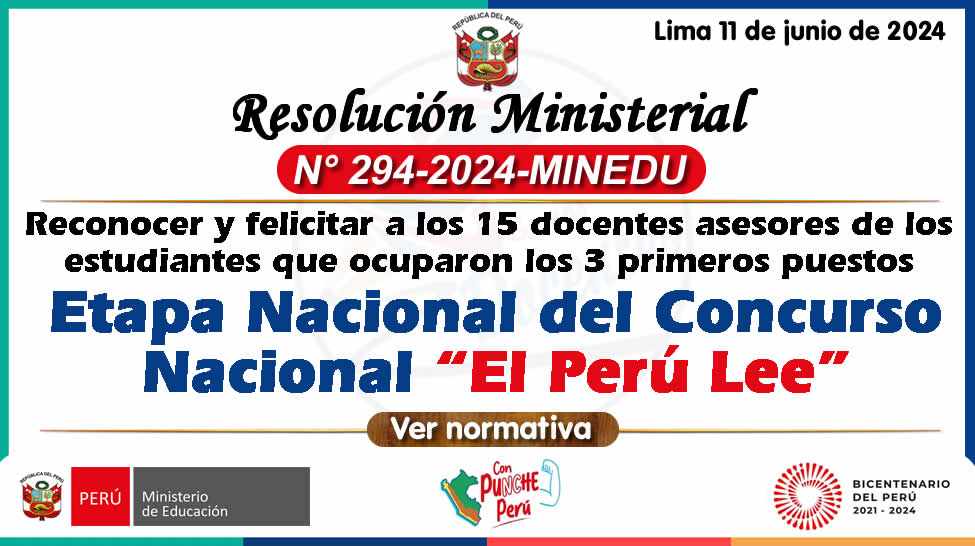 Resolución Ministerial N° 294-2024-MINEDU | 11 de junio de 2024 | Reconocer y felicitar a los quince (15) docentes asesores de los estudiantes que ocuparon los tres (03) primeros puestos en cada categoría de la etapa Nacional del Concurso Nacional de Comprensión Lectora para Instituciones Educativas públicas y privadas del Educación Básica Regular «El Perú Lee». organizado por el Ministerio de Educación.