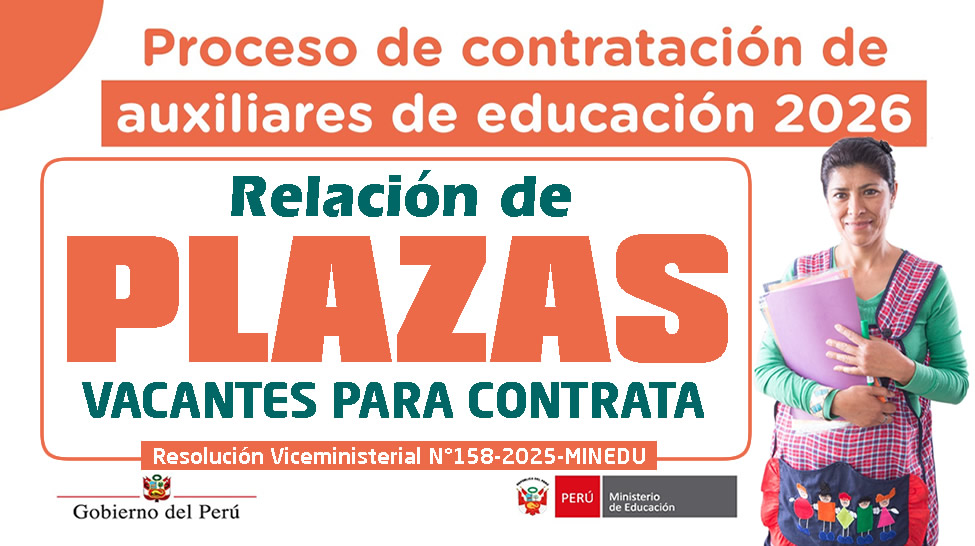 A continuación, se presenta la relación preliminar de plazas vacantes consideradas para el proceso de contratación de auxiliares de educación 2026. Cada DRE, GRE y UGEL deberá validar este listado de plazas a fin de que realicen la publicación final el 9 de enero de acuerdo al cronograma.
