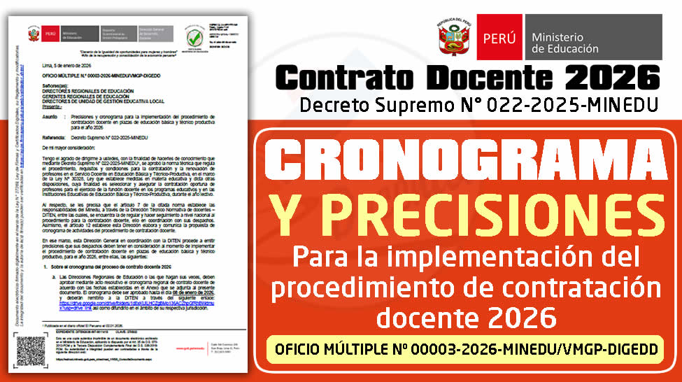 Contrato docente 2026: Precisiones y Cronograma para la implementación del procedimiento de contratación docente en plazas de educación básica y técnico productiva para el año 2026 | Oficio Múltiple N° 00003-2026-MINEDU/VMGP-DIGEDD