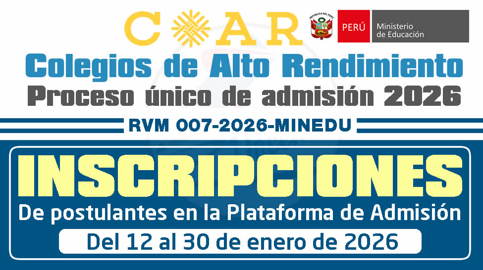 El Ministerio de Educación informa que se encuentra habilitada la inscripción de postulantes al Proceso Único de Admisión (PUA) 2026 a los Colegios de Alto Rendimiento (COAR), la cual se realizará del lunes 12 al viernes 30 de enero de 2026, a través de la plataforma oficial de admisión.