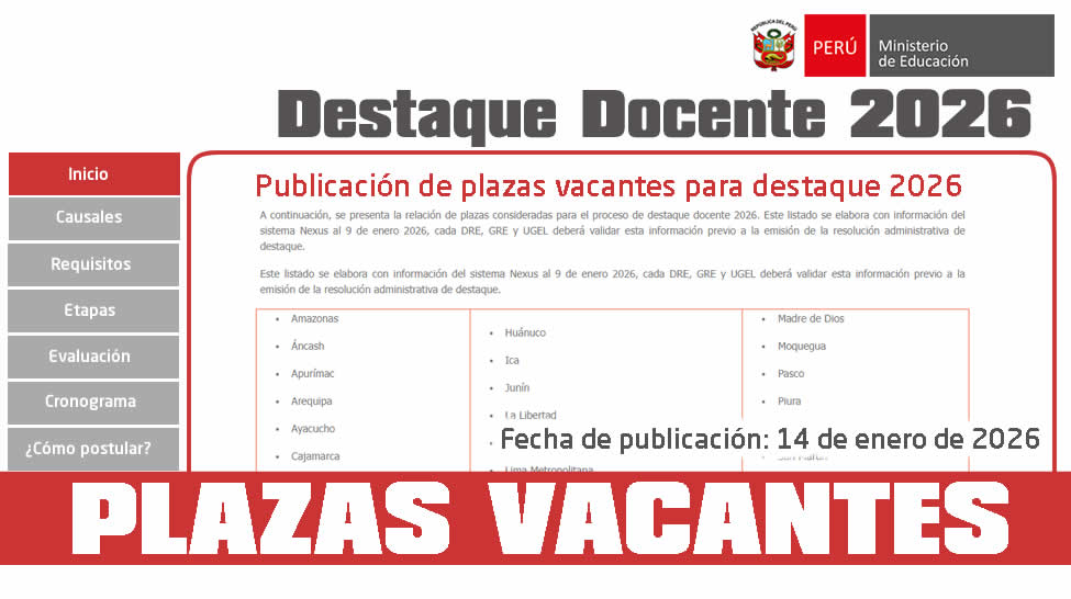 A continuación, se presenta la relación de plazas consideradas para el proceso de destaque docente 2026. Este listado se elabora con información del sistema Nexus al 9 de enero 2026, cada DRE, GRE y UGEL deberá validar esta información previo a la emisión de la resolución administrativa de destaque.