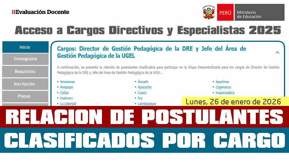 Hoy, 26 de enero de 2026, MINEDU publicará la Relación de Postulantes Clasificados para participar en la Etapa Descentralizada por cada cargo puesto a concurso del Concurso de Acceso a Cargos Directivos y de Especialistas 2025-2026