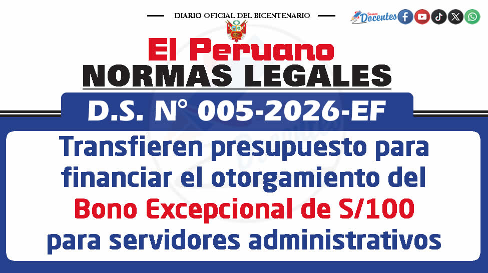 D.S. 005-2026-EF: Transferencia de Partidas en el Presupuesto para financiar el costo del otorgamiento del bono excepcional y por única vez de 100 soles para servidores administrativos