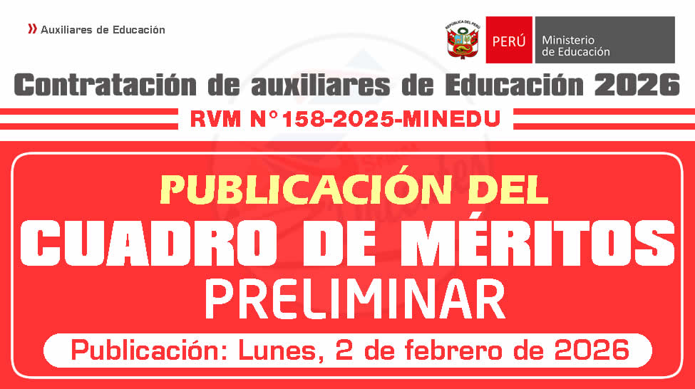 Este lunes, 2 de febrero de 2026, las UGEL y DRE de todo el país, a través de sus Comités de Contratación, publicarán el Cuadro de Méritos Preliminar correspondiente al proceso de Contratación de Auxiliares de Educación 2026, conforme a la Resolución Viceministerial N.º 158-2025-MINEDU.
