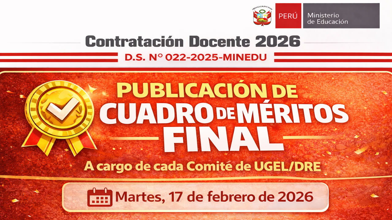 En el marco del proceso de Contratación Docente 2026, este martes 17 de febrero de 2026, cada UGEL y DRE del país, a través de sus Comités de Contratación, publicará el Cuadro de Méritos Final para la contratación por resultados de la Prueba Única Nacional (PUN).
